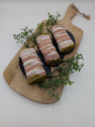 Dunne varkensschnitzel met kaas, prei en blanke ui gewikkeld in gerookt spek